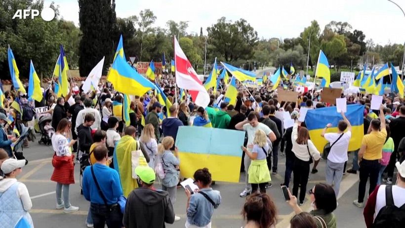 Bandiere giallo-blu, canti e striscioni con scritto “Stop war” a Nicosia