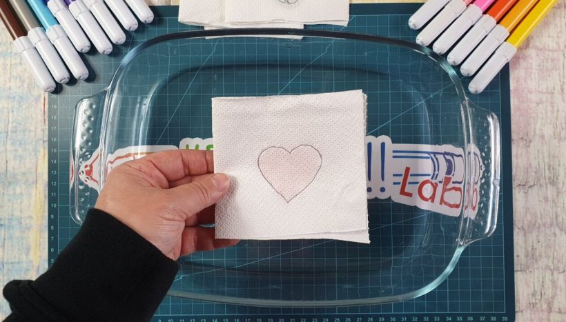 6. Appoggia delicatamente la carta da cucina sull’acqua, in pochi secondi vedrai il disegno colorarsi…da solo!