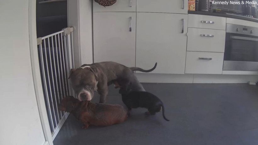 Un cane bassotto davvero geniale: eccolo ripreso dalla telecamera mentre usava i suoi amici cagnolini per scavalcare un cancelletto che lo teneva chiuso in cucina