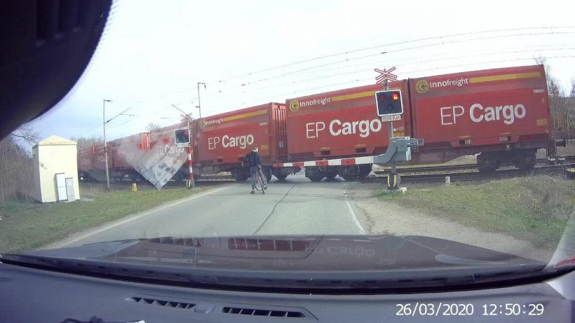Il video mostra un ciclista fermo al passaggio al livello, chiaramente impaziente. Nonostante la segnaletica stradale non desse ancora il via libera, il ragazzo decide di attraversare ugualmente la strada una volta che il treno è passato. Preso dalla fretta però, non si è reso conto che dall’altra parte del binario, un altro treno fosse in arrivo a tutta velocità. Appena in tempo, il ciclista inchioda ed evita il peggio, sfiorando il secondo treno per un soffio.