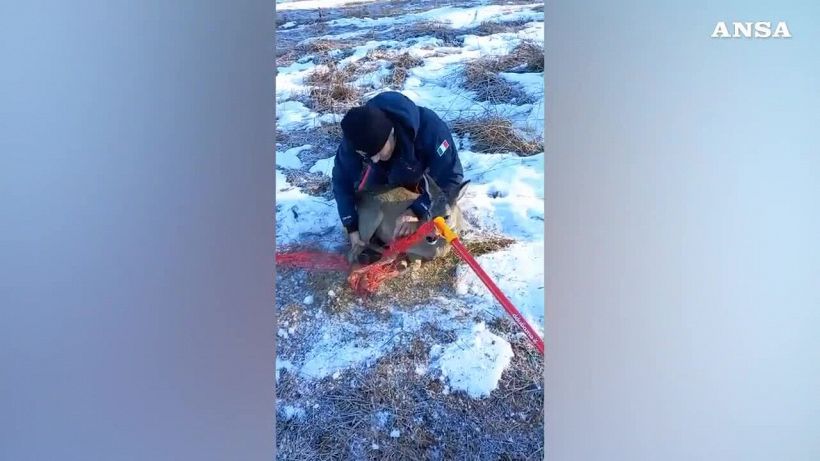 Prontamente i militari si recavano a bordo della motoslitta sul luogo segnalato dove trovavano una femmina adulta di capriolo immobilizzata a terra in quanto completamente avvolta nella rete di protezione.