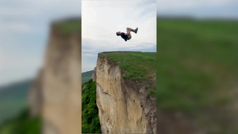 Una salto mortale all’indietro, la perdita dell’equilibrio e… la caduta dalla scogliera? No, solo un sapiente trucco, mix di tecnologia e prospettive.