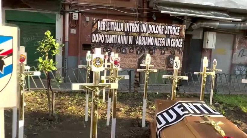 “Per l’Italia intera un dolore atroce, dopo tanti anni vi abbiamo messo in croce”, così su uno striscione in un cimitero improvvisato a Napoli, dove alcuni tifosi hanno inscenato un finto il funerale alle squadre di Serie A. (immagini di Abbate)